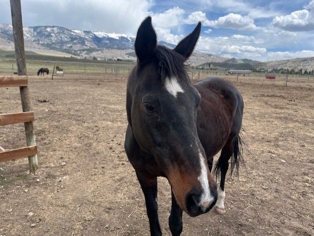 Rose is 17 year old Thoroughbred surrendered by her owner due to lack of time. Also Rose was a tad skinny, but has now filled out well. She was a little nervous but with the love of her new owner she is blossoming and making new friends, both human and horse! She is a beautiful mover, kind and gentle and is a great addition to the herd.